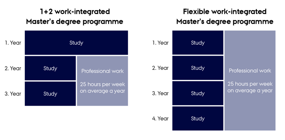 Here, students alternate between university studies and part-time employment (25 hours per week on average per year) at a company throughout the entire Master’s programme.
