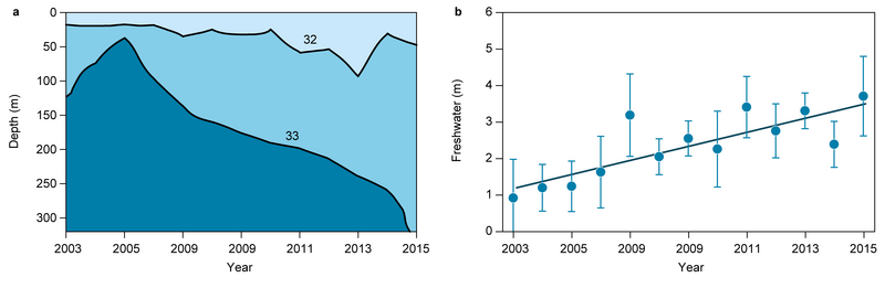 Unikke årlige målinger foretaget i forbindelse med klimamoniteringsprogramnet ”Greenland Ecosystem Monitoring program” siden 2003 i Nordøstgrønland taler nu sit klare sprog: Ferskvandets fra indlandsisen lægger sig i overfladelagene af det omgivende hav og trænger ind i de grønlandske fjorde.